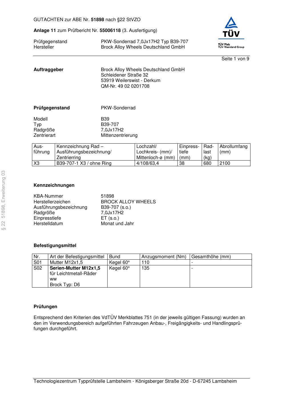 Dieses Gutachten (abe) bezieht sich auf die Alufelge Brock B39-707 in der Ausführung 7Jx17 ET 0, Mittenloch 0 mm (KBA 51898). Im PDF findest du typischerweise zulässige Reifengrößen, Auflagen/Anbauhinweise und – je nach Dokument – Hinweise zur Eintragung.