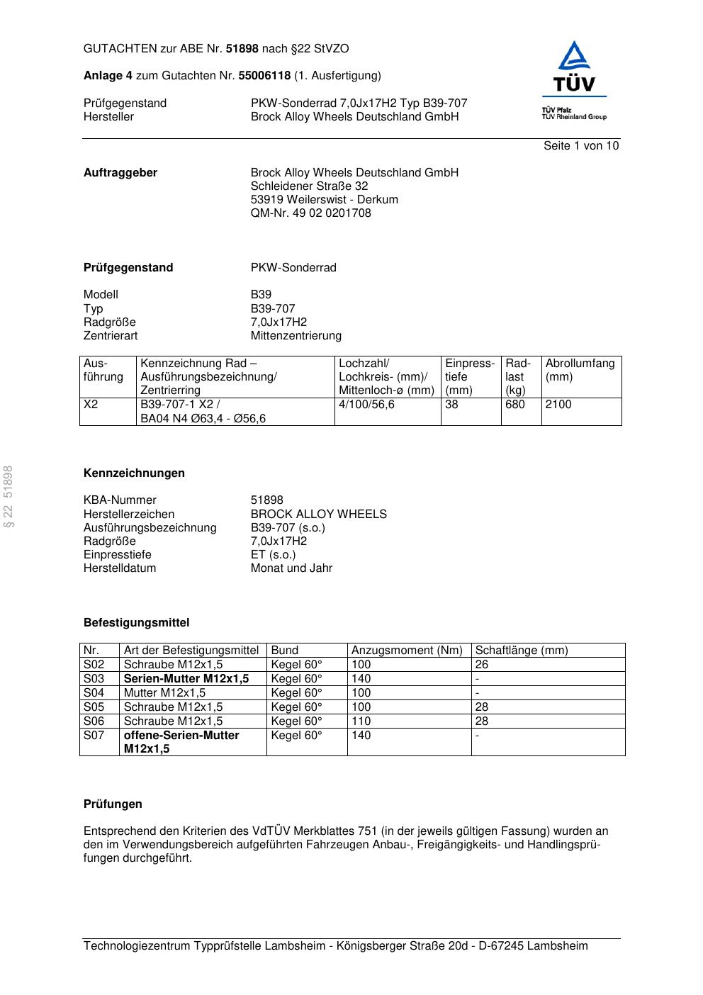 Dieses Gutachten (abe) bezieht sich auf die Alufelge Brock B39-707 in der Ausführung 7Jx17 ET 0, Mittenloch 0 mm (KBA 51898). Im PDF findest du typischerweise zulässige Reifengrößen, Auflagen/Anbauhinweise und – je nach Dokument – Hinweise zur Eintragung.