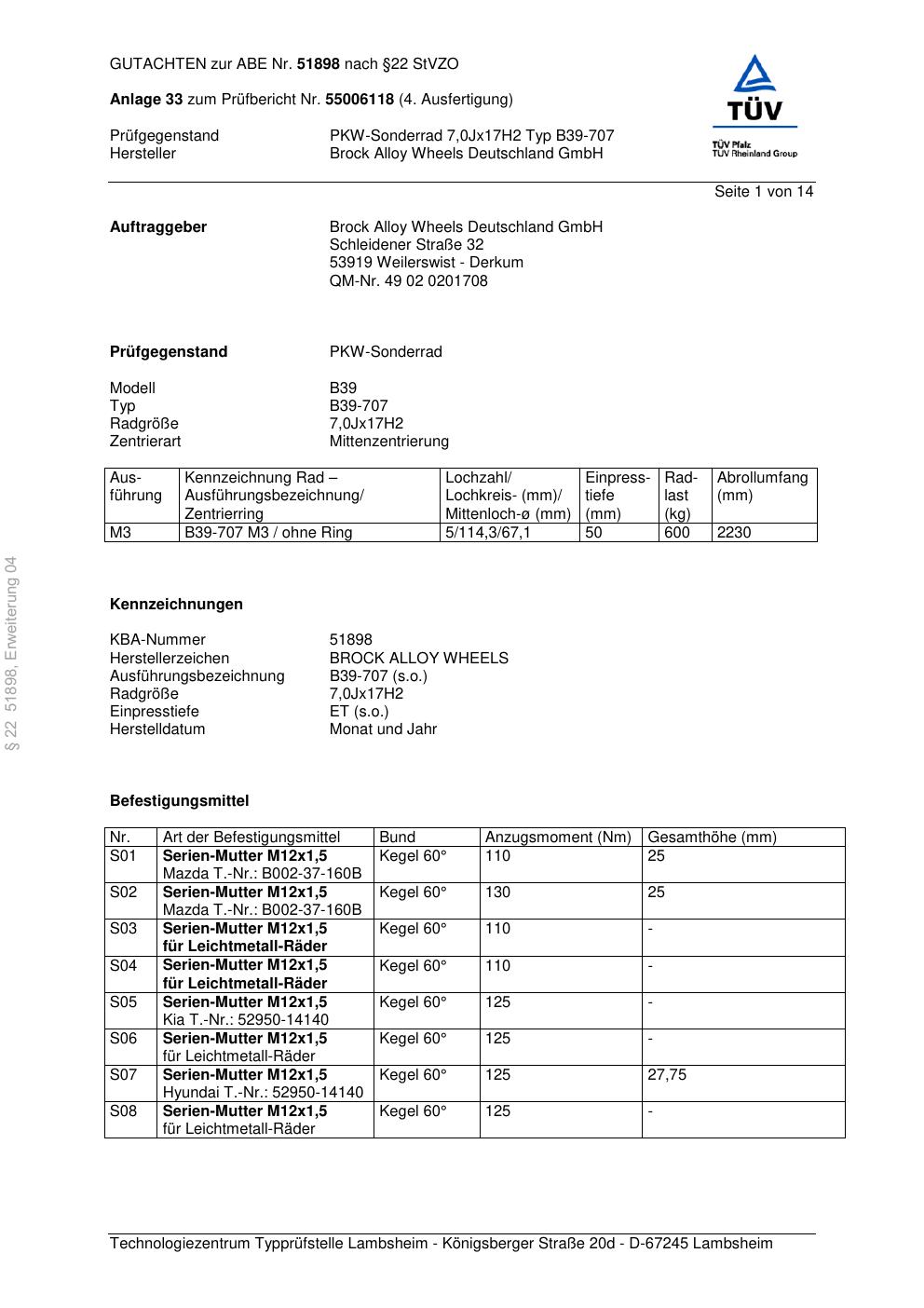 Dieses Gutachten (abe) bezieht sich auf die Alufelge Brock B39-707 in der Ausführung 7Jx17 ET 0, Mittenloch 0 mm (KBA 51898). Im PDF findest du typischerweise zulässige Reifengrößen, Auflagen/Anbauhinweise und – je nach Dokument – Hinweise zur Eintragung.