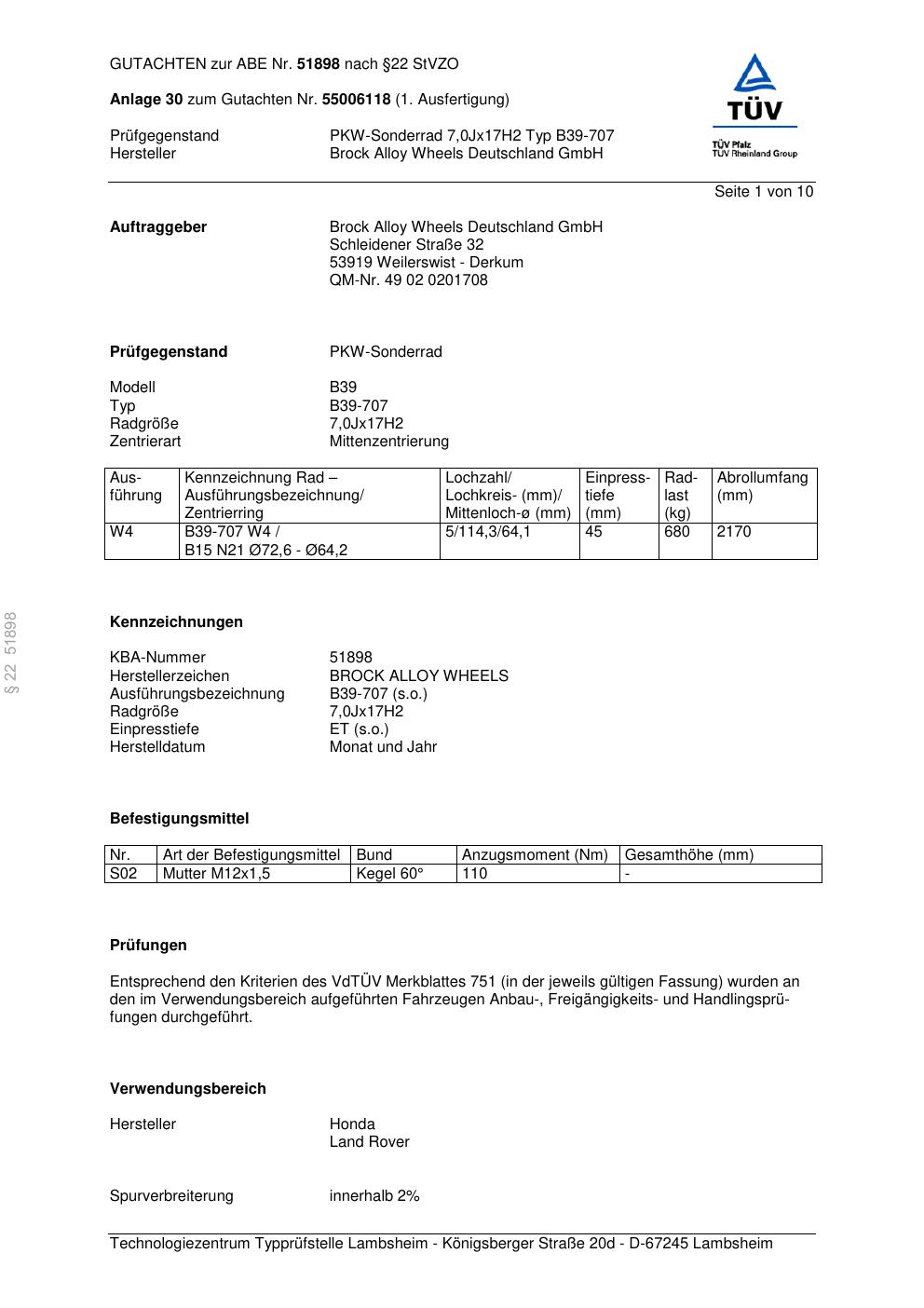 Dieses Gutachten (abe) bezieht sich auf die Alufelge Brock B39-707 in der Ausführung 7Jx17 ET 0, Mittenloch 0 mm (KBA 51898). Im PDF findest du typischerweise zulässige Reifengrößen, Auflagen/Anbauhinweise und – je nach Dokument – Hinweise zur Eintragung.
