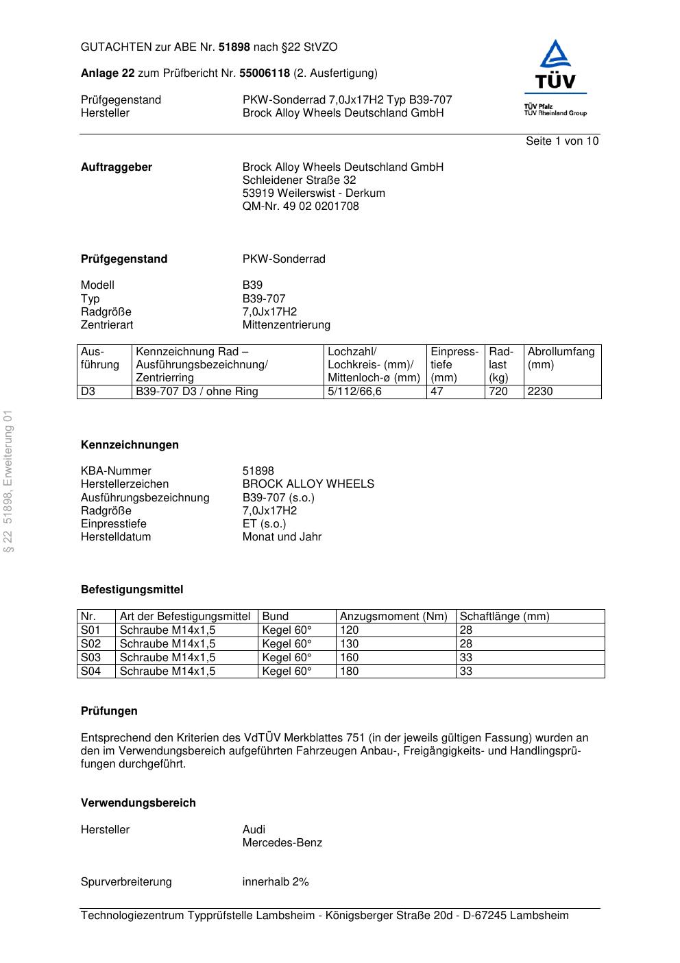 Dieses Gutachten (abe) bezieht sich auf die Alufelge Brock B39-707 in der Ausführung 7Jx17 ET 0, Mittenloch 0 mm (KBA 51898). Im PDF findest du typischerweise zulässige Reifengrößen, Auflagen/Anbauhinweise und – je nach Dokument – Hinweise zur Eintragung.