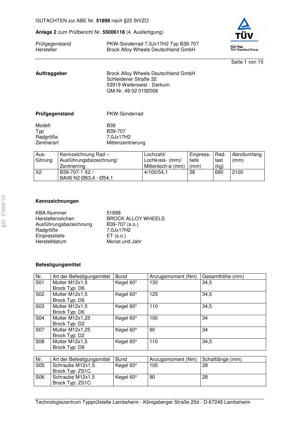 Dieses Gutachten (abe) bezieht sich auf die Alufelge Brock B39-707 in der Ausführung 7Jx17 ET 0, Mittenloch 0 mm (KBA 51898). Im PDF findest du typischerweise zulässige Reifengrößen, Auflagen/Anbauhinweise und – je nach Dokument – Hinweise zur Eintragung.