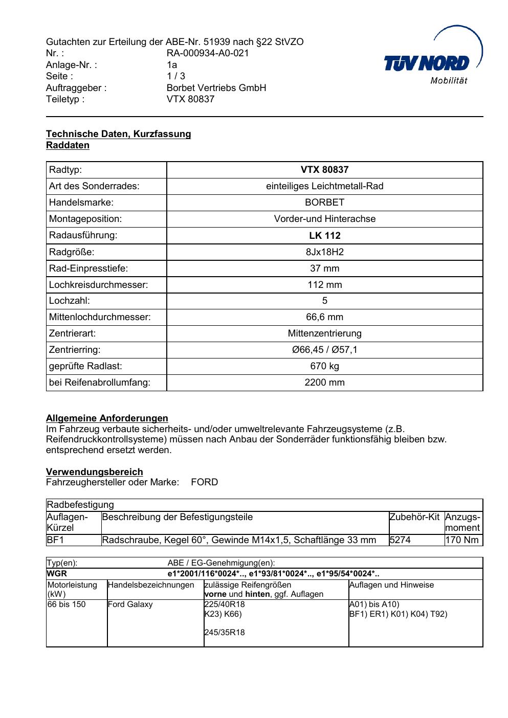 Dieses Gutachten (abe) bezieht sich auf die Alufelge brand-borbet VTX 80837 in der Ausführung 8Jx18 ET 0, Mittenloch 0 mm (KBA 51939). Im PDF findest du typischerweise zulässige Reifengrößen, Auflagen/Anbauhinweise und – je nach Dokument – Hinweise zur Eintragung.