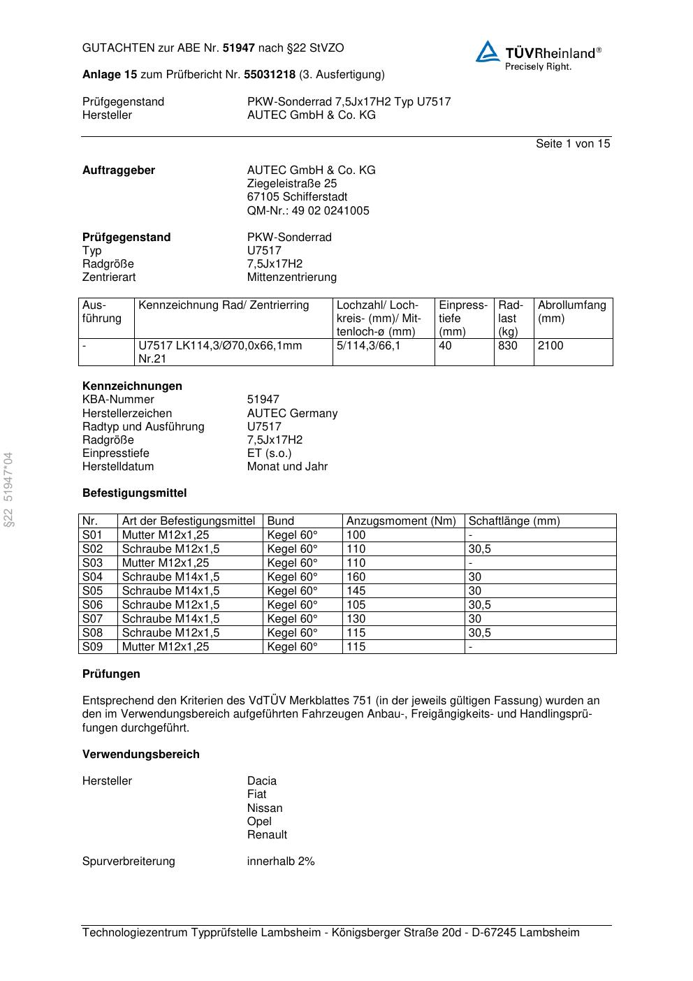 Dieses Gutachten (abe) bezieht sich auf die Alufelge Autec U7517 in der Ausführung 7.5Jx17 ET 0, Mittenloch 0 mm (KBA 51947). Im PDF findest du typischerweise zulässige Reifengrößen, Auflagen/Anbauhinweise und – je nach Dokument – Hinweise zur Eintragung.