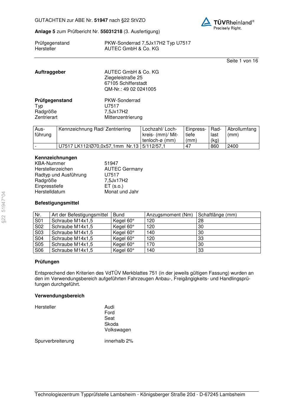 Dieses Gutachten (abe) bezieht sich auf die Alufelge Autec U7517 in der Ausführung 7.5Jx17 ET 0, Mittenloch 0 mm (KBA 51947). Im PDF findest du typischerweise zulässige Reifengrößen, Auflagen/Anbauhinweise und – je nach Dokument – Hinweise zur Eintragung.