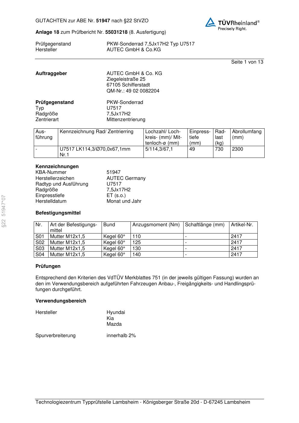 Dieses Gutachten (abe) bezieht sich auf die Alufelge Autec U7517 in der Ausführung 7.5Jx17 ET 0, Mittenloch 0 mm (KBA 51947). Im PDF findest du typischerweise zulässige Reifengrößen, Auflagen/Anbauhinweise und – je nach Dokument – Hinweise zur Eintragung.
