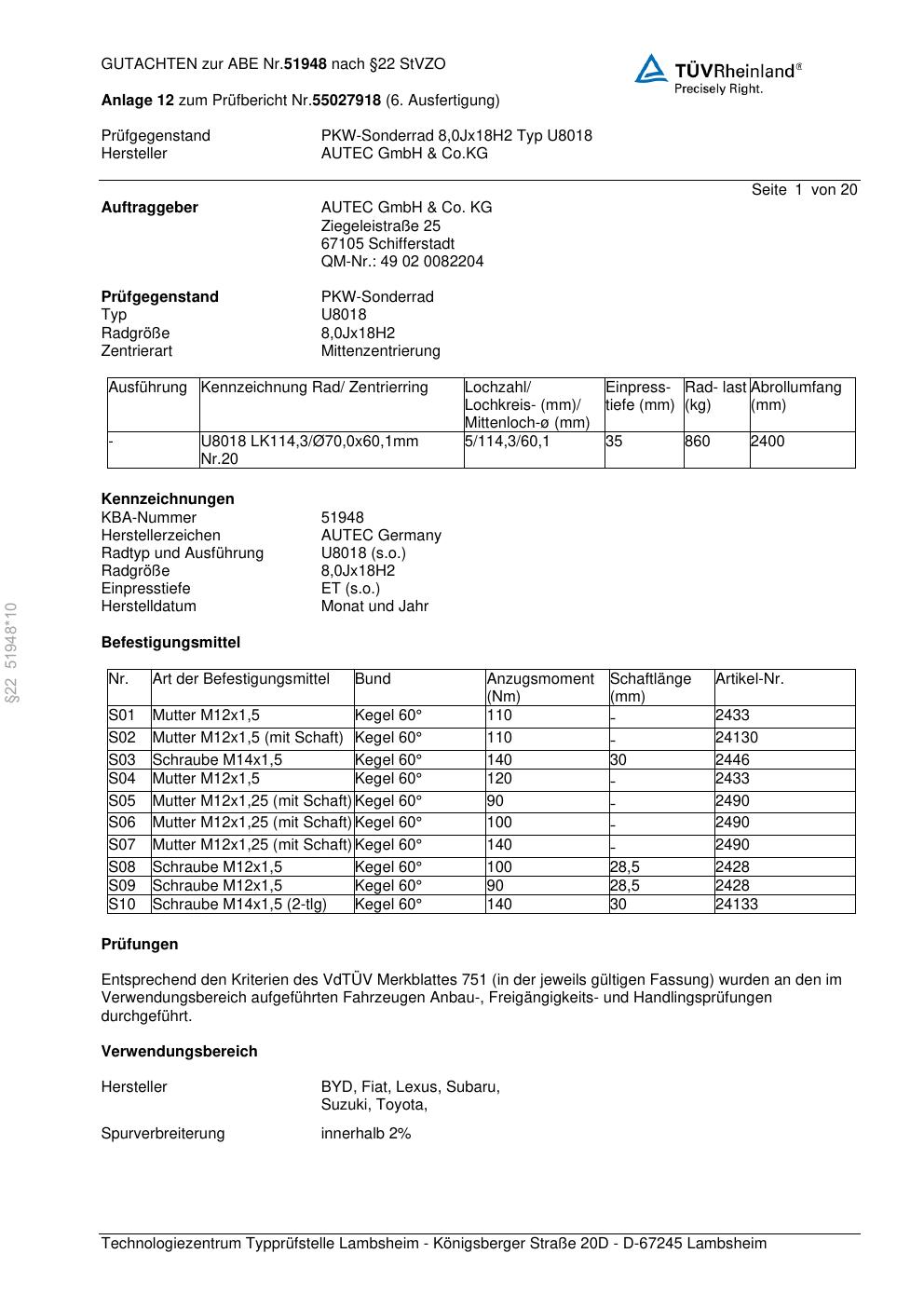 Dieses Gutachten (abe) bezieht sich auf die Alufelge Autec U8018 in der Ausführung 8Jx18 ET 0, Mittenloch 0 mm (KBA 51948). Im PDF findest du typischerweise zulässige Reifengrößen, Auflagen/Anbauhinweise und – je nach Dokument – Hinweise zur Eintragung.