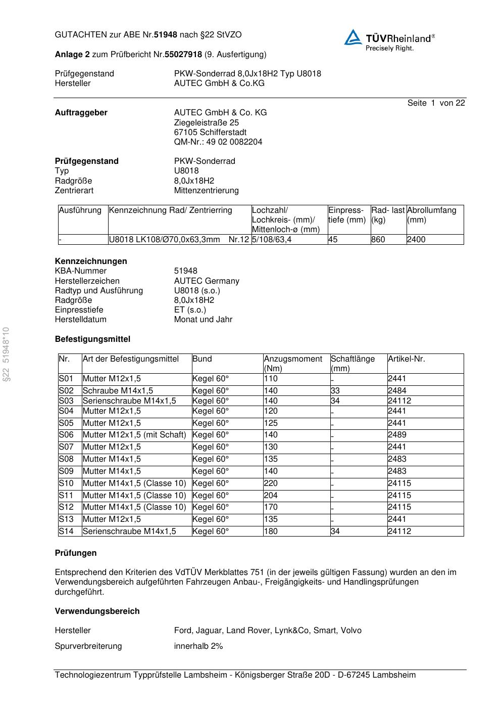 Dieses Gutachten (abe) bezieht sich auf die Alufelge Autec U8018 in der Ausführung 8Jx18 ET 0, Mittenloch 0 mm (KBA 51948). Im PDF findest du typischerweise zulässige Reifengrößen, Auflagen/Anbauhinweise und – je nach Dokument – Hinweise zur Eintragung.