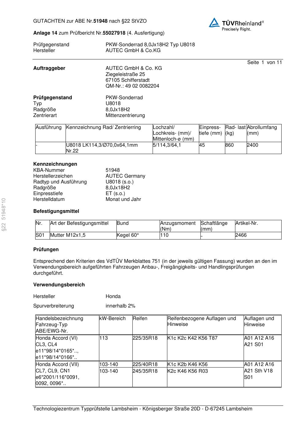 Dieses Gutachten (abe) bezieht sich auf die Alufelge Autec U8018 in der Ausführung 8Jx18 ET 0, Mittenloch 0 mm (KBA 51948). Im PDF findest du typischerweise zulässige Reifengrößen, Auflagen/Anbauhinweise und – je nach Dokument – Hinweise zur Eintragung.