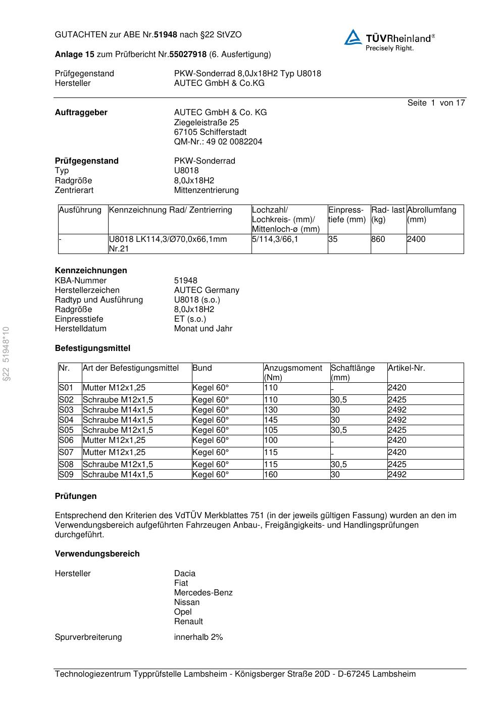 Dieses Gutachten (abe) bezieht sich auf die Alufelge Autec U8018 in der Ausführung 8Jx18 ET 0, Mittenloch 0 mm (KBA 51948). Im PDF findest du typischerweise zulässige Reifengrößen, Auflagen/Anbauhinweise und – je nach Dokument – Hinweise zur Eintragung.