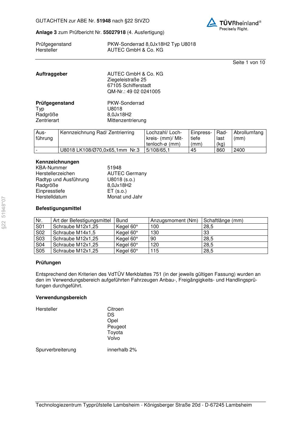 Dieses Gutachten (abe) bezieht sich auf die Alufelge Autec U8018 in der Ausführung 8Jx18 ET 0, Mittenloch 0 mm (KBA 51948). Im PDF findest du typischerweise zulässige Reifengrößen, Auflagen/Anbauhinweise und – je nach Dokument – Hinweise zur Eintragung.
