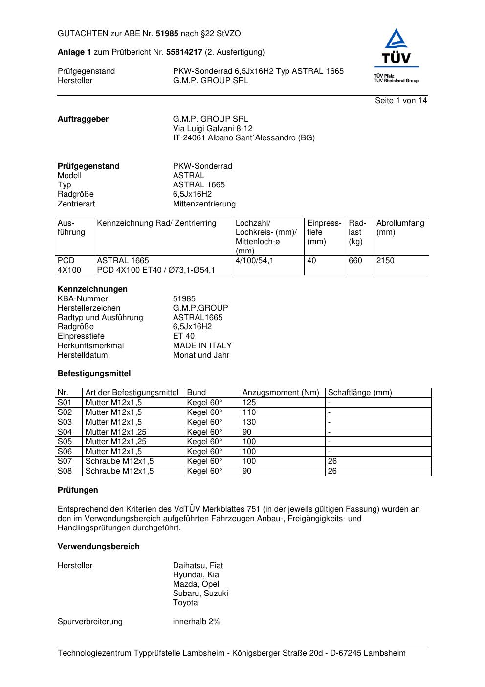 Felgengutachten / abe für Alufelgen ATS ASTRAL 1 665 (6.5Jx16 ET 0, Mittenloch 0 mm) mit KBA 51985 (Zertifikatsnummer 51985). Hier kostenlos als PDF herunterladen. Der Download-Link ist 24 Stunden gültig und kann bis zu zwei Mal verwendet werden.