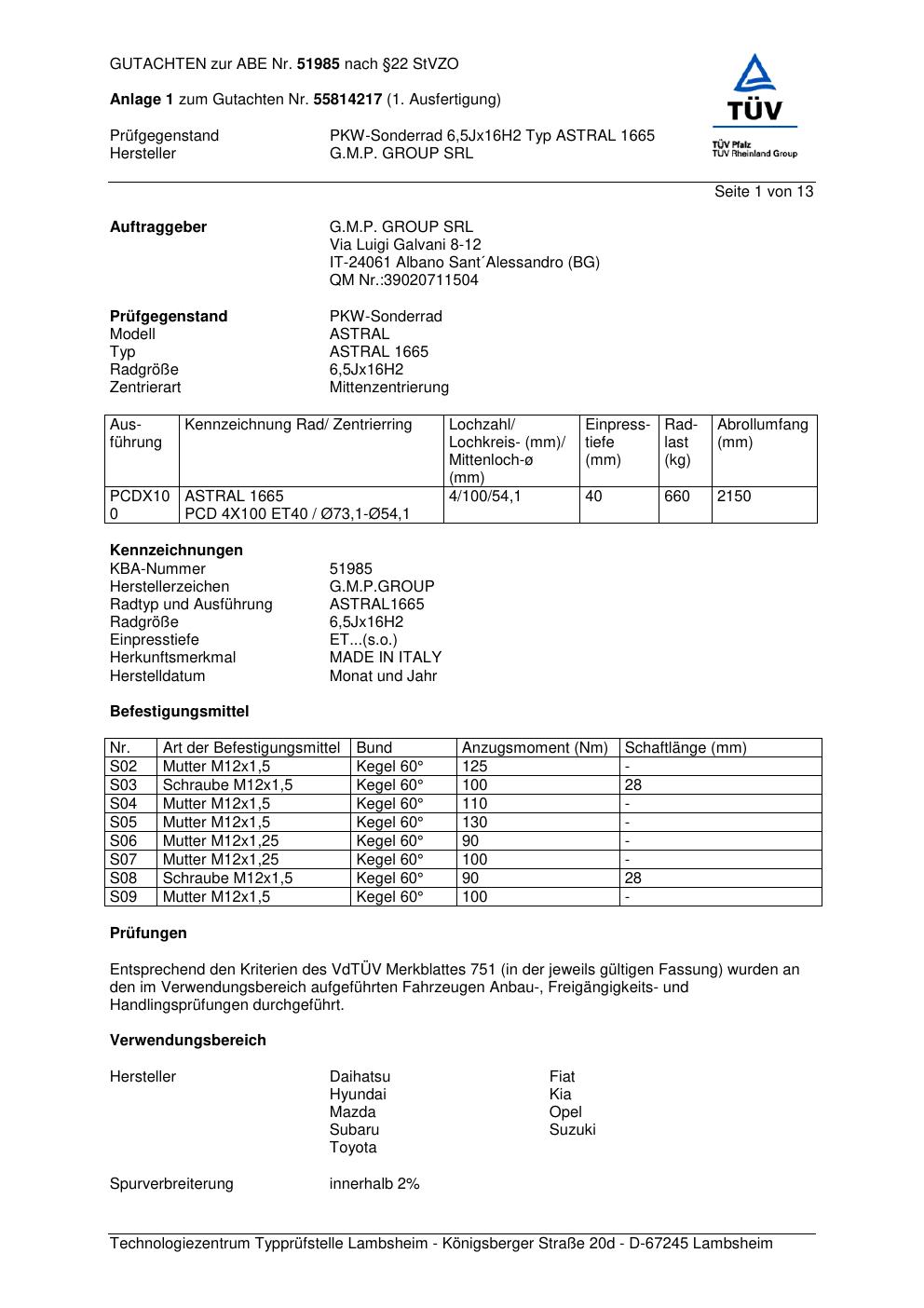 Dieses Gutachten (abe) bezieht sich auf die Alufelge ATS ASTRAL 1 665 in der Ausführung 6.5Jx16 ET 0, Mittenloch 0 mm (KBA 51985). Im PDF findest du typischerweise zulässige Reifengrößen, Auflagen/Anbauhinweise und – je nach Dokument – Hinweise zur Eintragung.