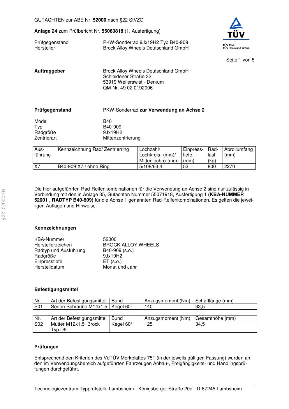 Dieses Gutachten (abe) bezieht sich auf die Alufelge Brock B40-909 in der Ausführung 9Jx19 ET 0, Mittenloch 0 mm (KBA 52000). Im PDF findest du typischerweise zulässige Reifengrößen, Auflagen/Anbauhinweise und – je nach Dokument – Hinweise zur Eintragung.