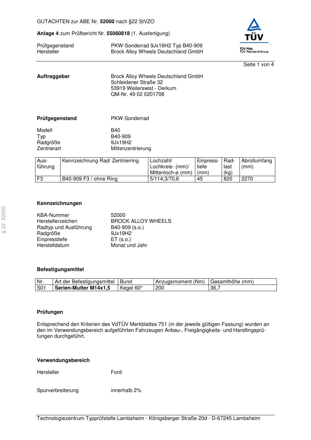 Felgengutachten / abe für Alufelgen Brock B40-909 (9Jx19 ET 0, Mittenloch 0 mm) mit KBA 52000 (Zertifikatsnummer 52000). Hier kostenlos als PDF herunterladen. Der Download-Link ist 24 Stunden gültig und kann bis zu zwei Mal verwendet werden.