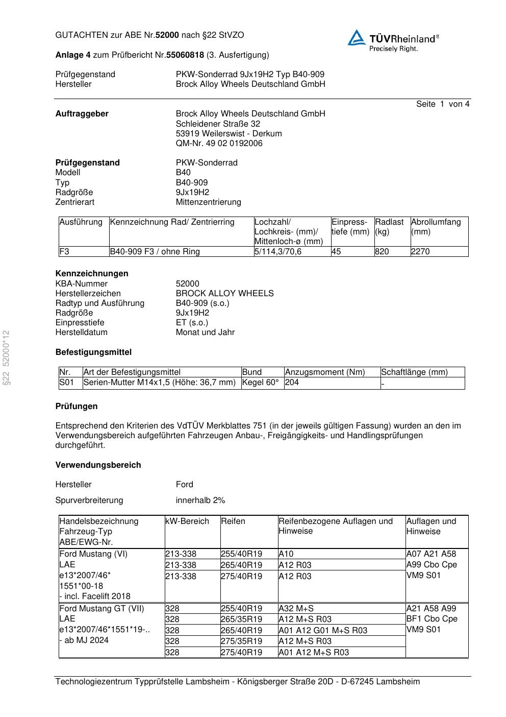 Dieses Gutachten (abe) bezieht sich auf die Alufelge Brock B40-909 in der Ausführung 9Jx19 ET 0, Mittenloch 0 mm (KBA 52000). Im PDF findest du typischerweise zulässige Reifengrößen, Auflagen/Anbauhinweise und – je nach Dokument – Hinweise zur Eintragung.