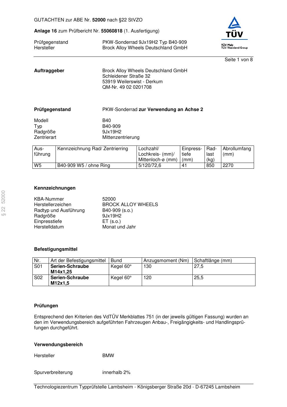 Felgengutachten / abe für Alufelgen Brock B40-909 (9Jx19 ET 0, Mittenloch 0 mm) mit KBA 52000 (Zertifikatsnummer 52000). Hier kostenlos als PDF herunterladen. Der Download-Link ist 24 Stunden gültig und kann bis zu zwei Mal verwendet werden.