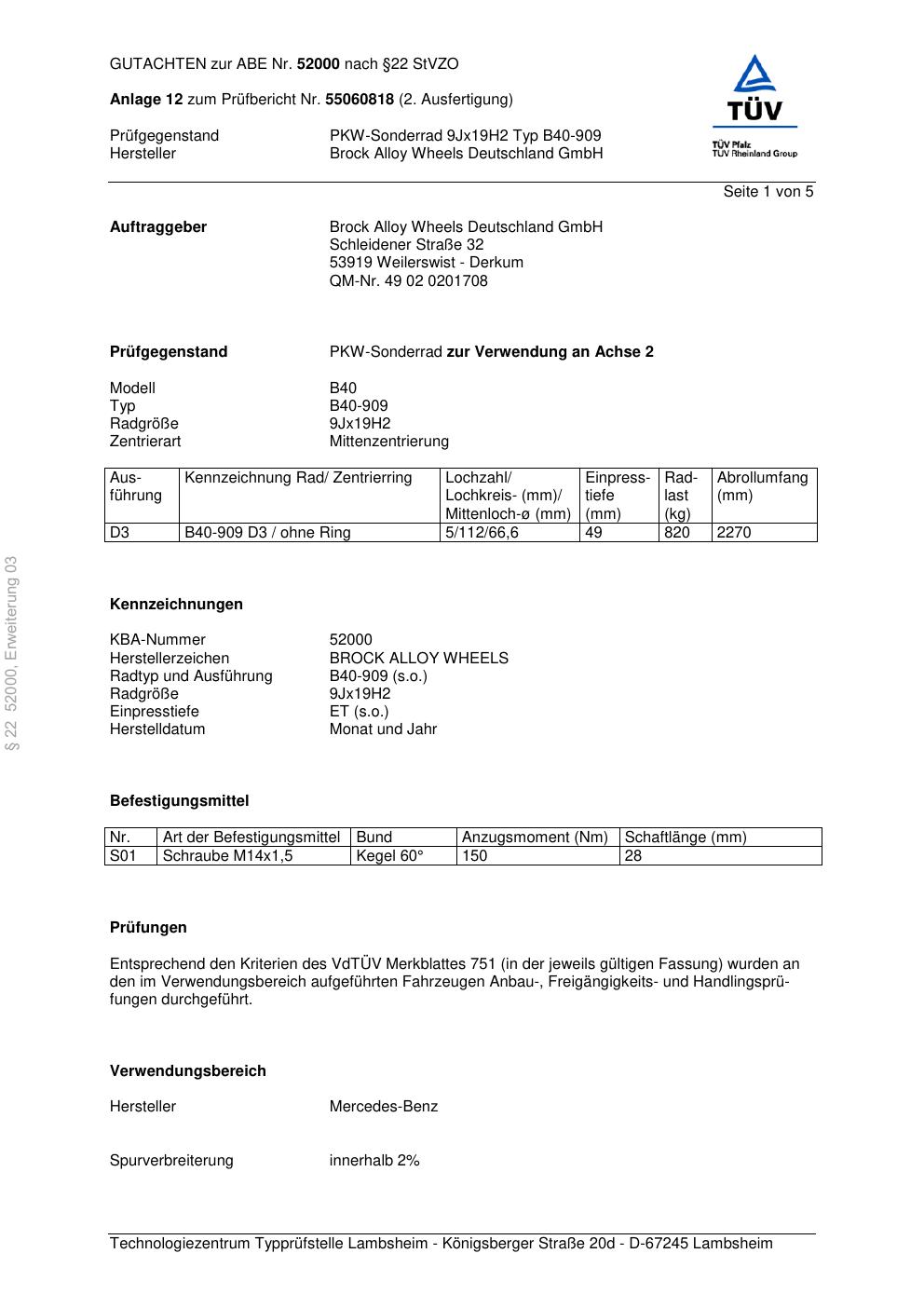 Dieses Gutachten (abe) bezieht sich auf die Alufelge Brock B40-909 in der Ausführung 9Jx19 ET 0, Mittenloch 0 mm (KBA 52000). Im PDF findest du typischerweise zulässige Reifengrößen, Auflagen/Anbauhinweise und – je nach Dokument – Hinweise zur Eintragung.