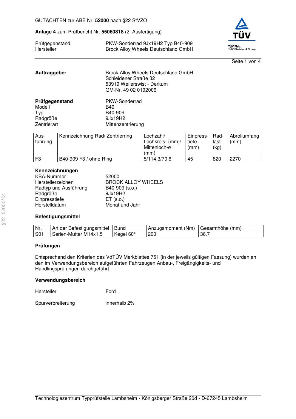 Dieses Gutachten (abe) bezieht sich auf die Alufelge Brock B40-909 in der Ausführung 9Jx19 ET 0, Mittenloch 0 mm (KBA 52000). Im PDF findest du typischerweise zulässige Reifengrößen, Auflagen/Anbauhinweise und – je nach Dokument – Hinweise zur Eintragung.