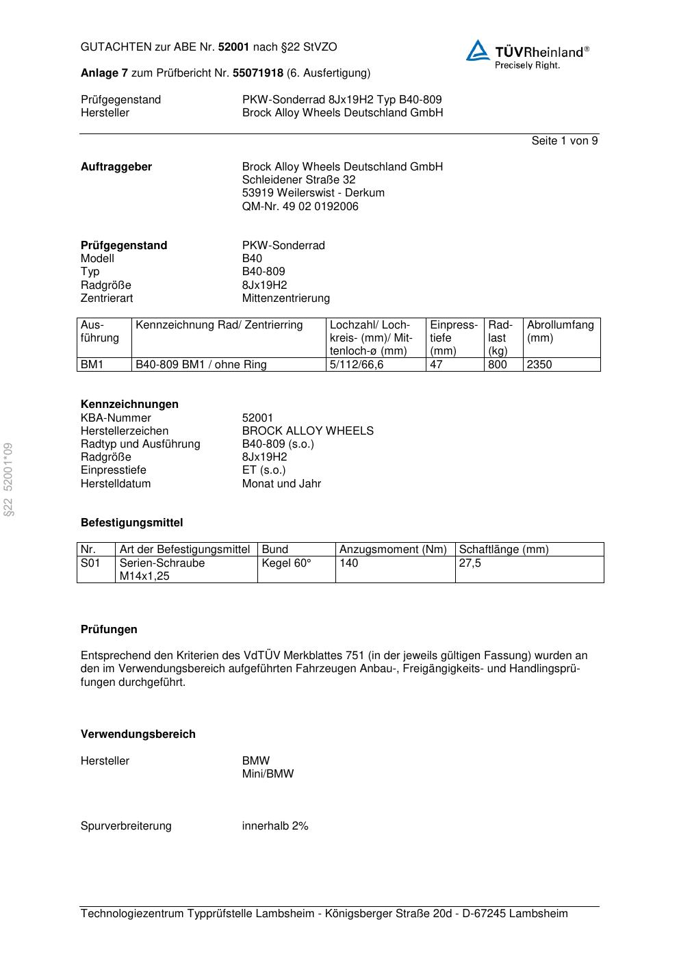 Felgengutachten / abe für Alufelgen Brock B40-809 (8Jx19 ET 0, Mittenloch 0 mm) mit KBA 52001 (Zertifikatsnummer 52001). Hier kostenlos als PDF herunterladen. Der Download-Link ist 24 Stunden gültig und kann bis zu zwei Mal verwendet werden.