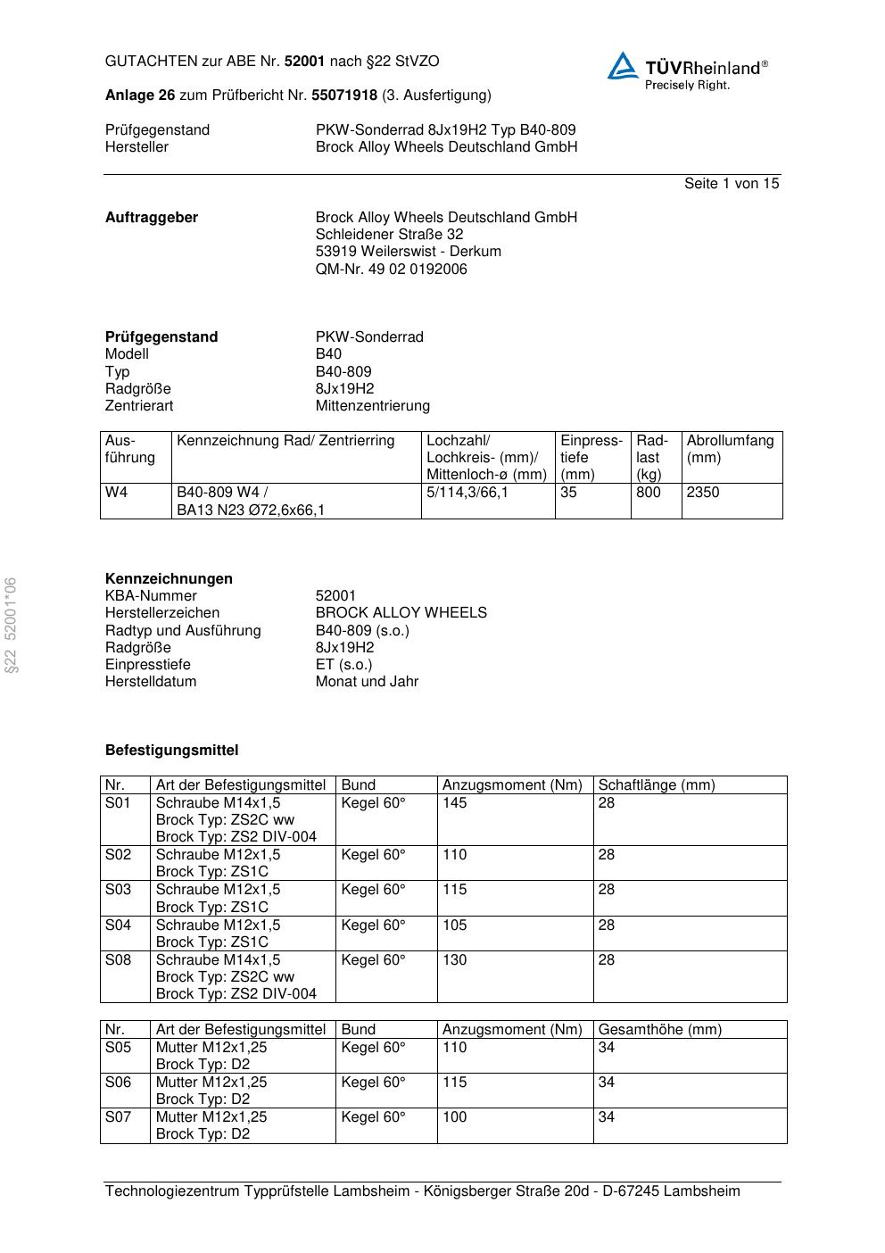 Felgengutachten / abe für Alufelgen Brock B40-809 (8Jx19 ET 0, Mittenloch 0 mm) mit KBA 52001 (Zertifikatsnummer 52001). Hier kostenlos als PDF herunterladen. Der Download-Link ist 24 Stunden gültig und kann bis zu zwei Mal verwendet werden.