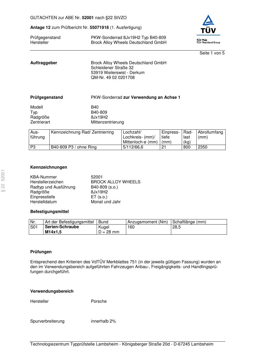 Felgengutachten / abe für Alufelgen Brock B40-809 (8Jx19 ET 0, Mittenloch 0 mm) mit KBA 52001 (Zertifikatsnummer 52001). Hier kostenlos als PDF herunterladen. Der Download-Link ist 24 Stunden gültig und kann bis zu zwei Mal verwendet werden.