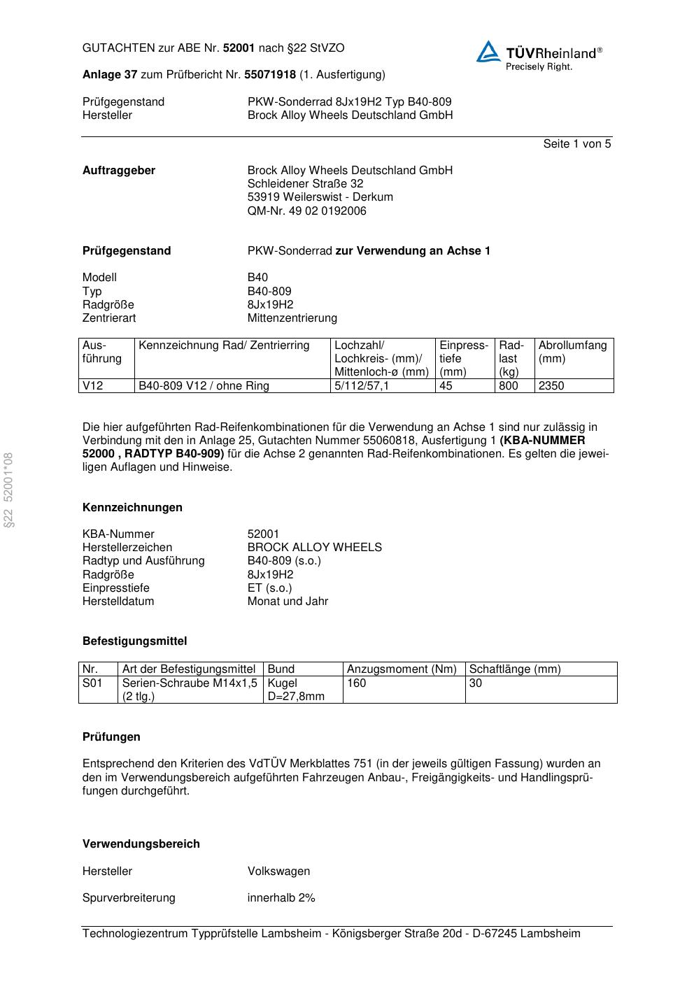Dieses Gutachten (abe) bezieht sich auf die Alufelge Brock B40-809 in der Ausführung 8Jx19 ET 0, Mittenloch 0 mm (KBA 52001). Im PDF findest du typischerweise zulässige Reifengrößen, Auflagen/Anbauhinweise und – je nach Dokument – Hinweise zur Eintragung.