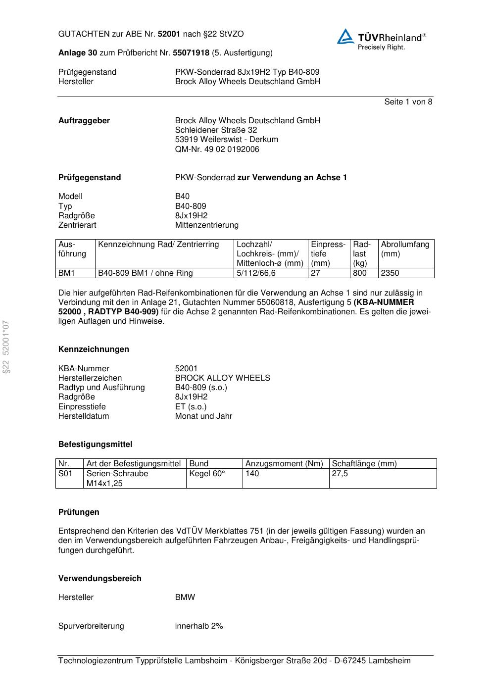 Felgengutachten / abe für Alufelgen Brock B40-809 (8Jx19 ET 0, Mittenloch 0 mm) mit KBA 52001 (Zertifikatsnummer 52001). Hier kostenlos als PDF herunterladen. Der Download-Link ist 24 Stunden gültig und kann bis zu zwei Mal verwendet werden.