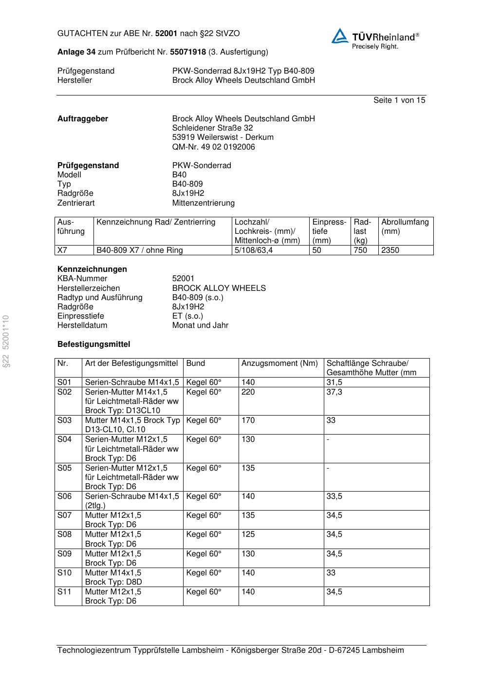 Dieses Gutachten (abe) bezieht sich auf die Alufelge Brock B40-809 in der Ausführung 8Jx19 ET 0, Mittenloch 0 mm (KBA 52001). Im PDF findest du typischerweise zulässige Reifengrößen, Auflagen/Anbauhinweise und – je nach Dokument – Hinweise zur Eintragung.