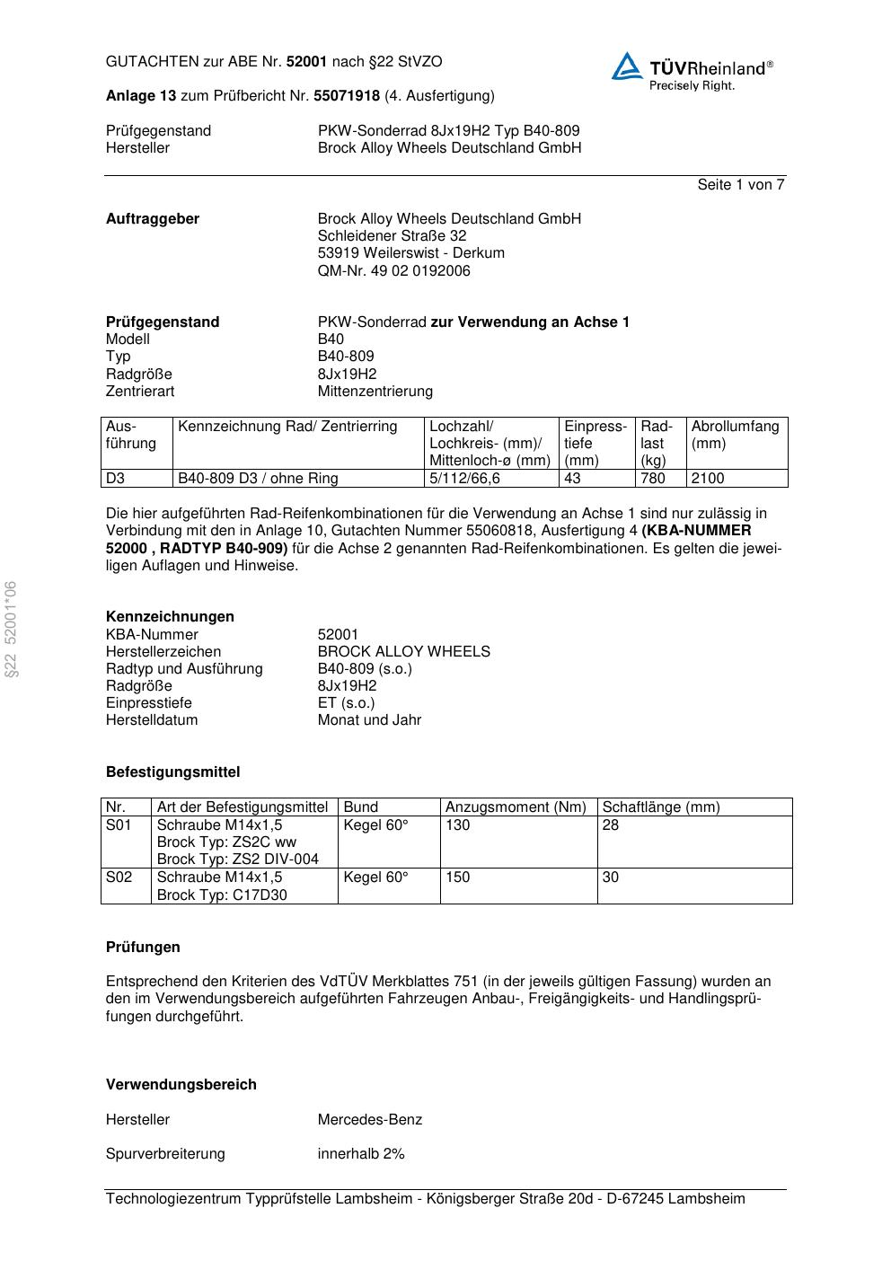 Felgengutachten / abe für Alufelgen Brock B40-809 (8Jx19 ET 0, Mittenloch 0 mm) mit KBA 52001 (Zertifikatsnummer 52001). Hier kostenlos als PDF herunterladen. Der Download-Link ist 24 Stunden gültig und kann bis zu zwei Mal verwendet werden.