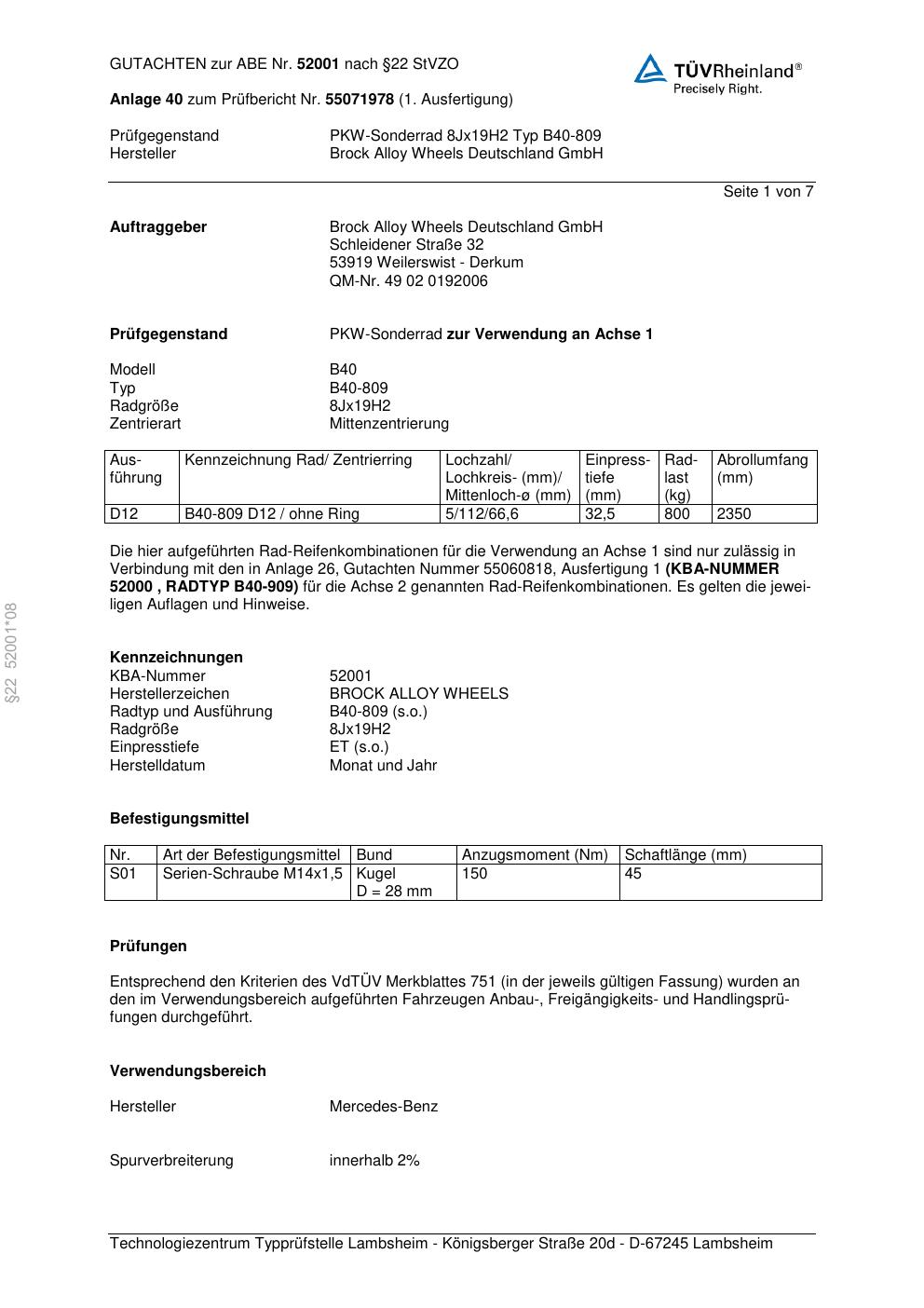 Dieses Gutachten (abe) bezieht sich auf die Alufelge Brock B40-809 in der Ausführung 8Jx19 ET 0, Mittenloch 0 mm (KBA 52001). Im PDF findest du typischerweise zulässige Reifengrößen, Auflagen/Anbauhinweise und – je nach Dokument – Hinweise zur Eintragung.