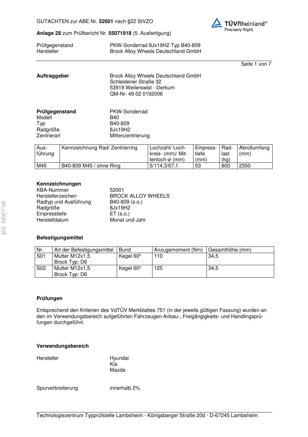 Dieses Gutachten (abe) bezieht sich auf die Alufelge Brock B40-809 in der Ausführung 8Jx19 ET 0, Mittenloch 0 mm (KBA 52001). Im PDF findest du typischerweise zulässige Reifengrößen, Auflagen/Anbauhinweise und – je nach Dokument – Hinweise zur Eintragung.