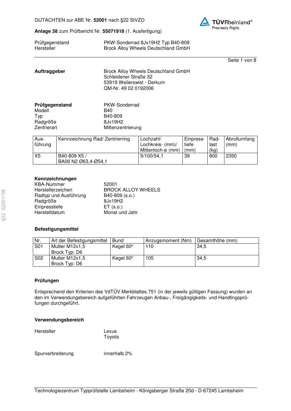 Felgengutachten / abe für Alufelgen Brock B40-809 (8Jx19 ET 0, Mittenloch 0 mm) mit KBA 52001 (Zertifikatsnummer 52001). Hier kostenlos als PDF herunterladen. Der Download-Link ist 24 Stunden gültig und kann bis zu zwei Mal verwendet werden.