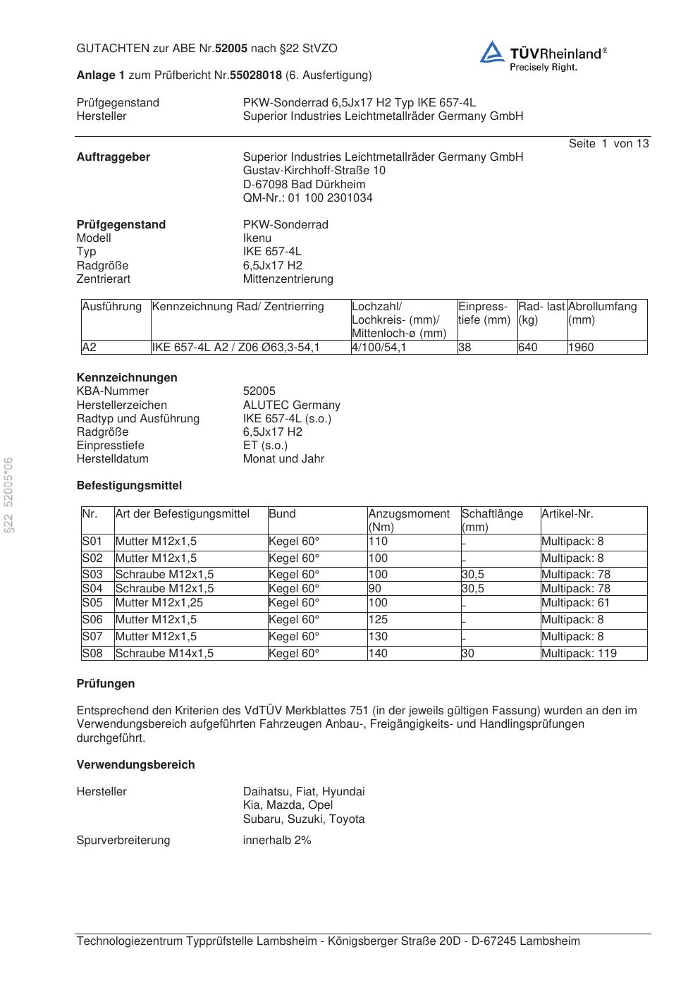 Dieses Gutachten (abe) bezieht sich auf die Alufelge ALUTEC IKE 657-4L in der Ausführung 6.5Jx17 ET 0, Mittenloch 0 mm (KBA 52005). Im PDF findest du typischerweise zulässige Reifengrößen, Auflagen/Anbauhinweise und – je nach Dokument – Hinweise zur Eintragung.