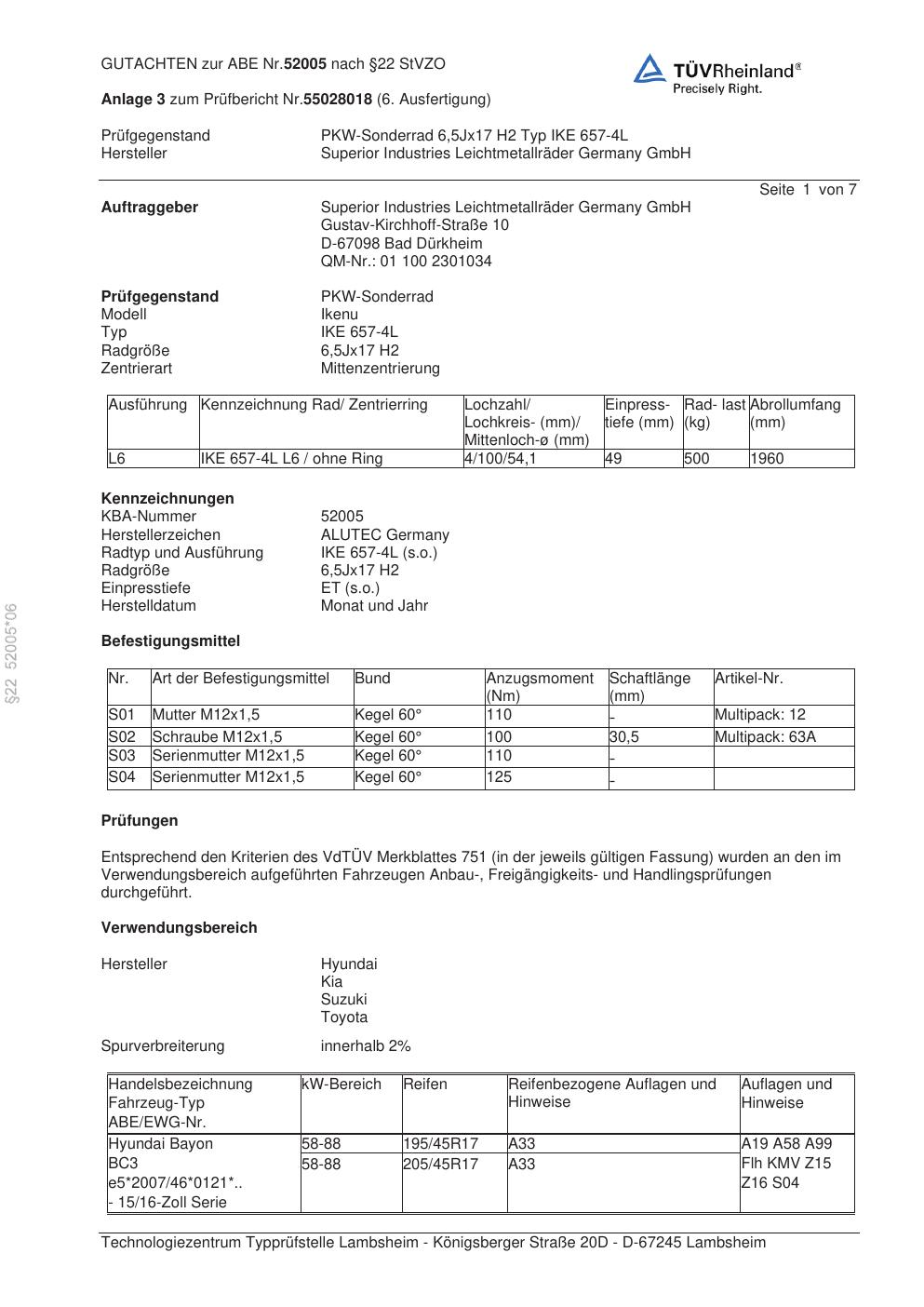 Dieses Gutachten (abe) bezieht sich auf die Alufelge ALUTEC IKE 657-4L in der Ausführung 6.5Jx17 ET 0, Mittenloch 0 mm (KBA 52005). Im PDF findest du typischerweise zulässige Reifengrößen, Auflagen/Anbauhinweise und – je nach Dokument – Hinweise zur Eintragung.