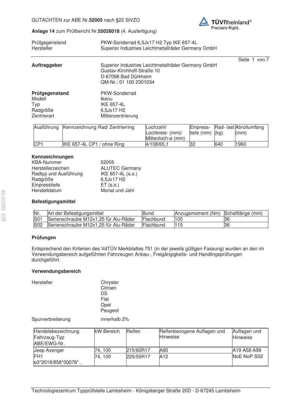 Dieses Gutachten (abe) bezieht sich auf die Alufelge ALUTEC IKE 657-4L in der Ausführung 6.5Jx17 ET 0, Mittenloch 0 mm (KBA 52005). Im PDF findest du typischerweise zulässige Reifengrößen, Auflagen/Anbauhinweise und – je nach Dokument – Hinweise zur Eintragung.