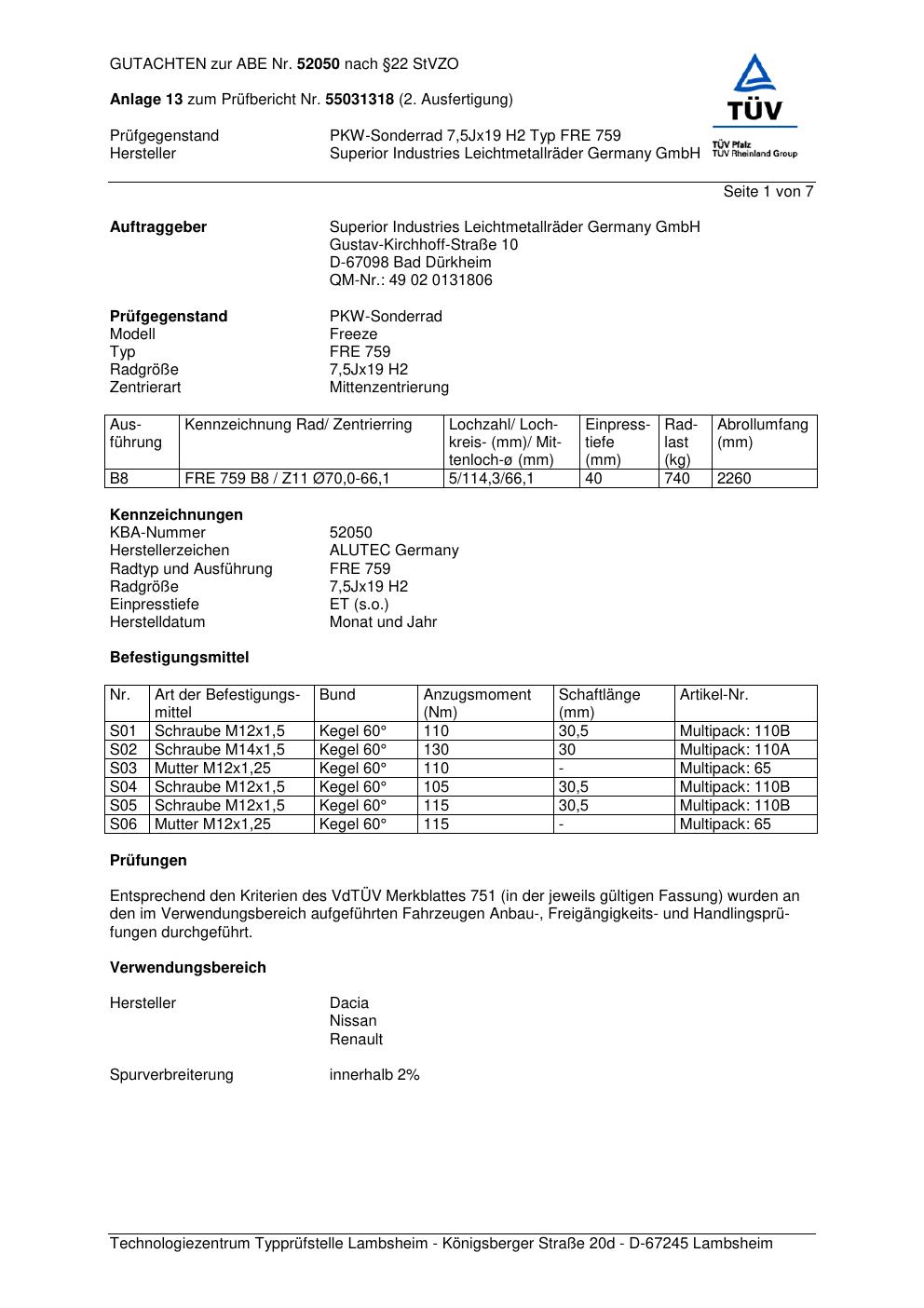 Dieses Gutachten (abe) bezieht sich auf die Alufelge ALUTEC FRE 759 in der Ausführung 7.5Jx19 ET 0, Mittenloch 0 mm (KBA 52050). Im PDF findest du typischerweise zulässige Reifengrößen, Auflagen/Anbauhinweise und – je nach Dokument – Hinweise zur Eintragung.