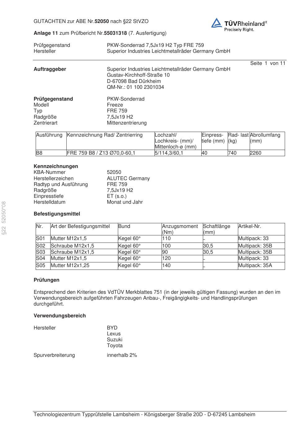 Dieses Gutachten (abe) bezieht sich auf die Alufelge ALUTEC FRE 759 in der Ausführung 7.5Jx19 ET 0, Mittenloch 0 mm (KBA 52050). Im PDF findest du typischerweise zulässige Reifengrößen, Auflagen/Anbauhinweise und – je nach Dokument – Hinweise zur Eintragung.