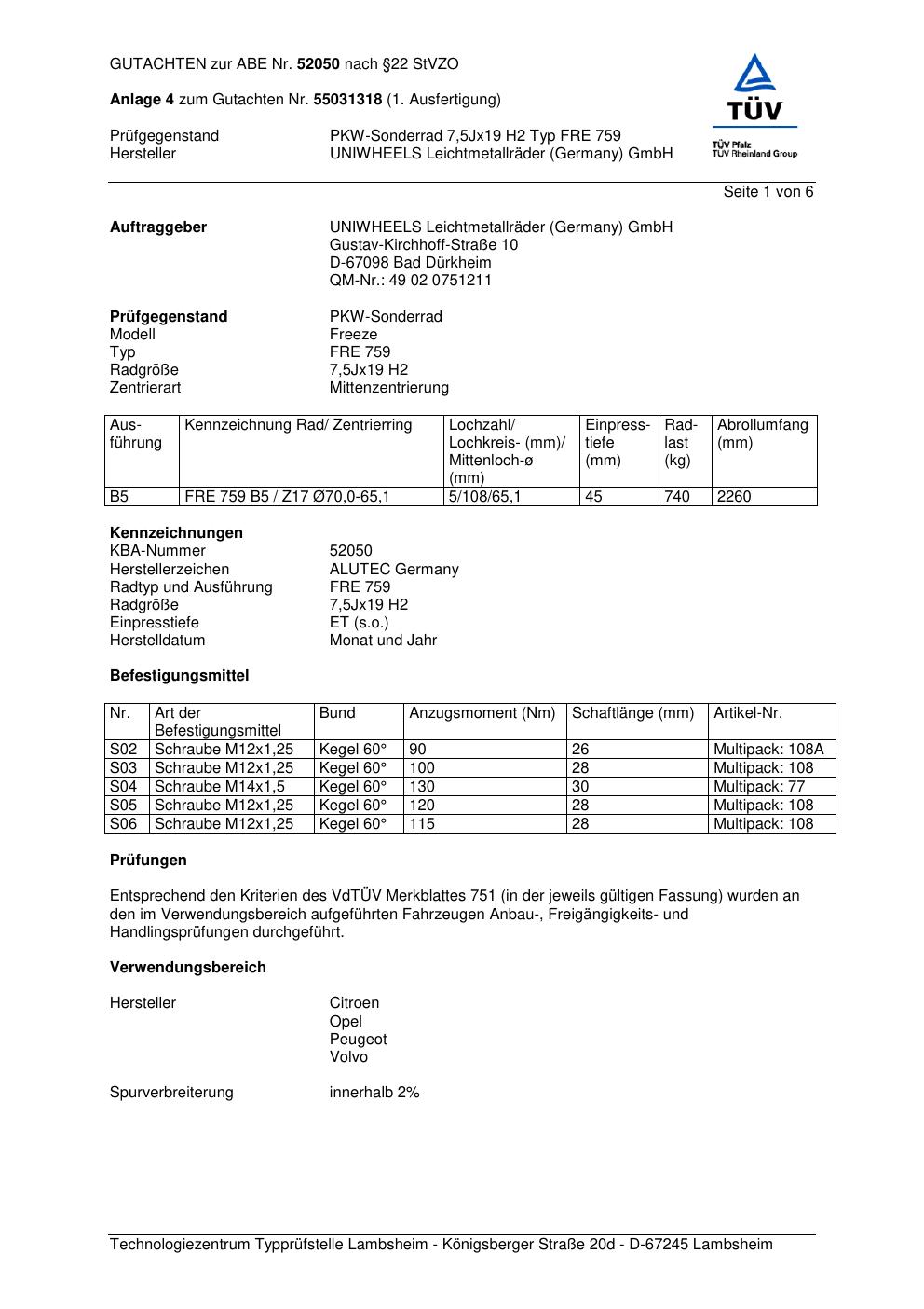 Dieses Gutachten (abe) bezieht sich auf die Alufelge ALUTEC FRE 759 in der Ausführung 7.5Jx19 ET 0, Mittenloch 0 mm (KBA 52050). Im PDF findest du typischerweise zulässige Reifengrößen, Auflagen/Anbauhinweise und – je nach Dokument – Hinweise zur Eintragung.
