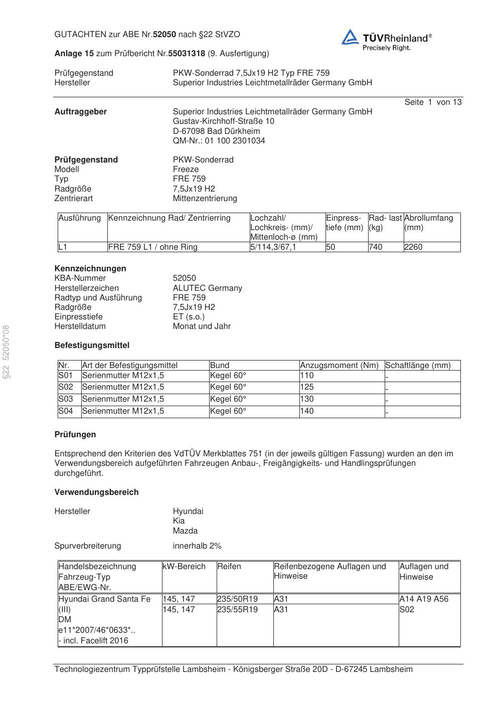 Dieses Gutachten (abe) bezieht sich auf die Alufelge ALUTEC FRE 759 in der Ausführung 7.5Jx19 ET 0, Mittenloch 0 mm (KBA 52050). Im PDF findest du typischerweise zulässige Reifengrößen, Auflagen/Anbauhinweise und – je nach Dokument – Hinweise zur Eintragung.