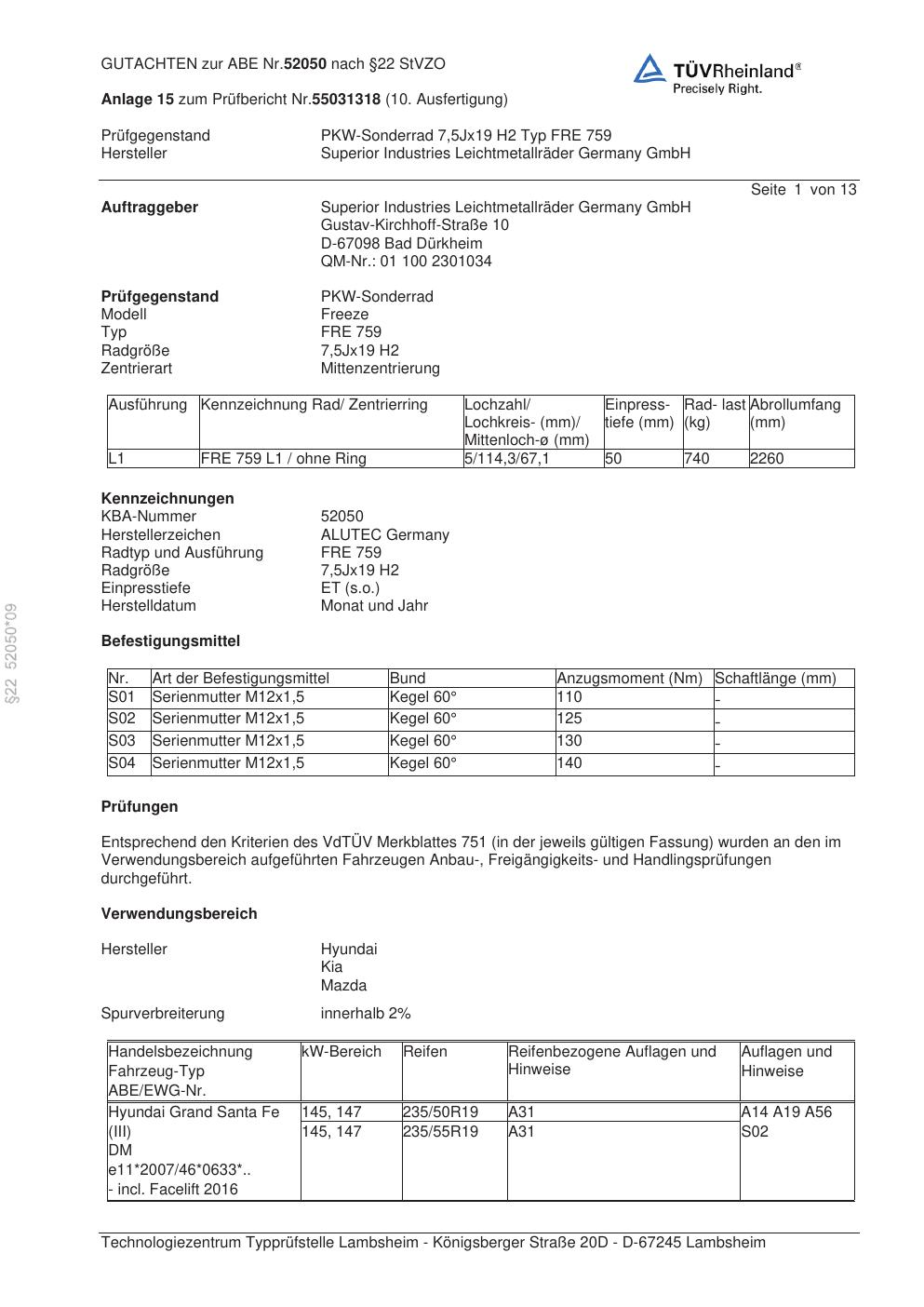 Dieses Gutachten (abe) bezieht sich auf die Alufelge ALUTEC FRE 759 in der Ausführung 7.5Jx19 ET 0, Mittenloch 0 mm (KBA 52050). Im PDF findest du typischerweise zulässige Reifengrößen, Auflagen/Anbauhinweise und – je nach Dokument – Hinweise zur Eintragung.
