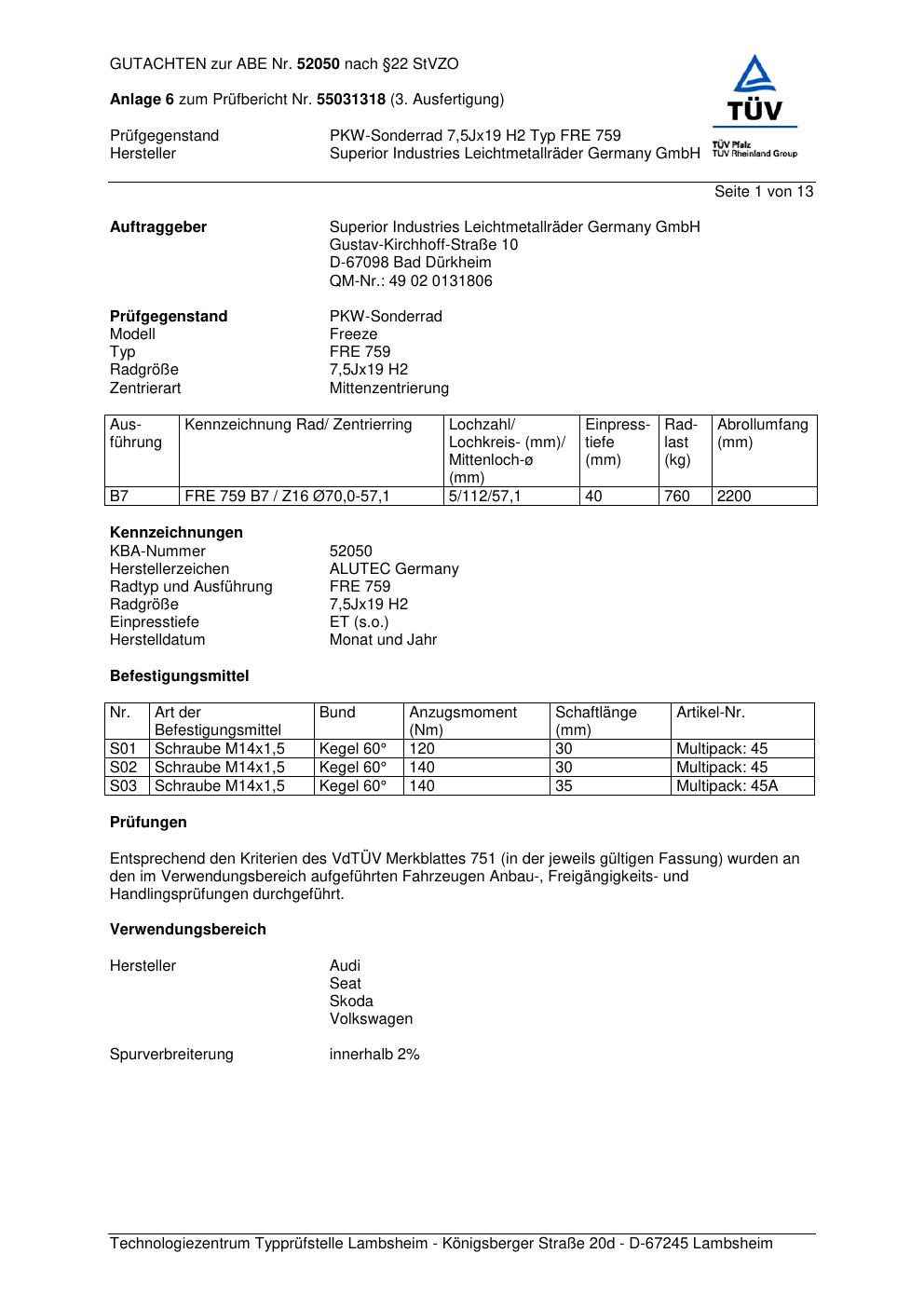 Felgengutachten / abe für Alufelgen ALUTEC FRE 759 (7.5Jx19 ET 0, Mittenloch 0 mm) mit KBA 52050 (Zertifikatsnummer 52050). Hier kostenlos als PDF herunterladen. Der Download-Link ist 24 Stunden gültig und kann bis zu zwei Mal verwendet werden.
