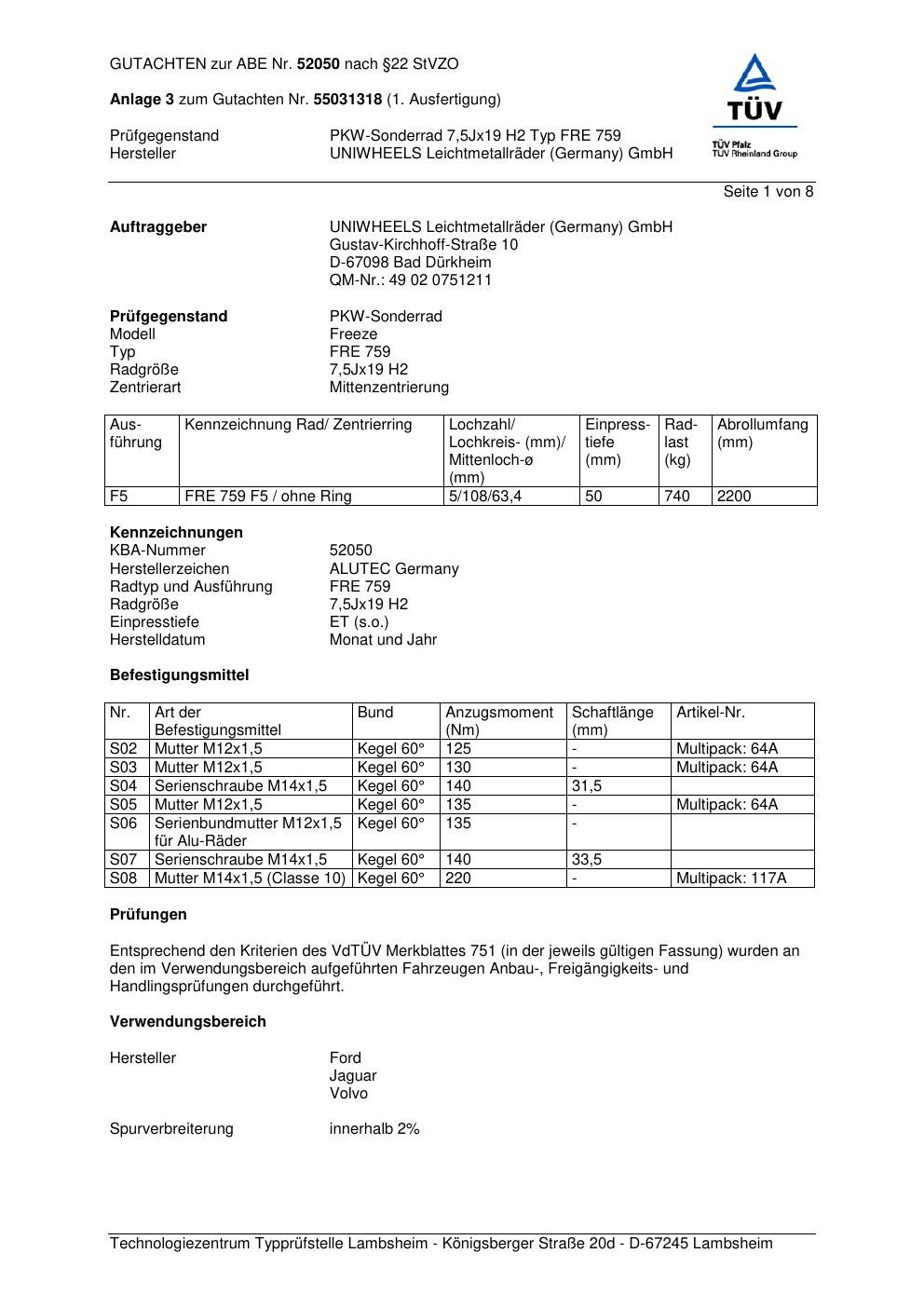 Felgengutachten / abe für Alufelgen ALUTEC FRE 759 (7.5Jx19 ET 0, Mittenloch 0 mm) mit KBA 52050 (Zertifikatsnummer 52050). Hier kostenlos als PDF herunterladen. Der Download-Link ist 24 Stunden gültig und kann bis zu zwei Mal verwendet werden.