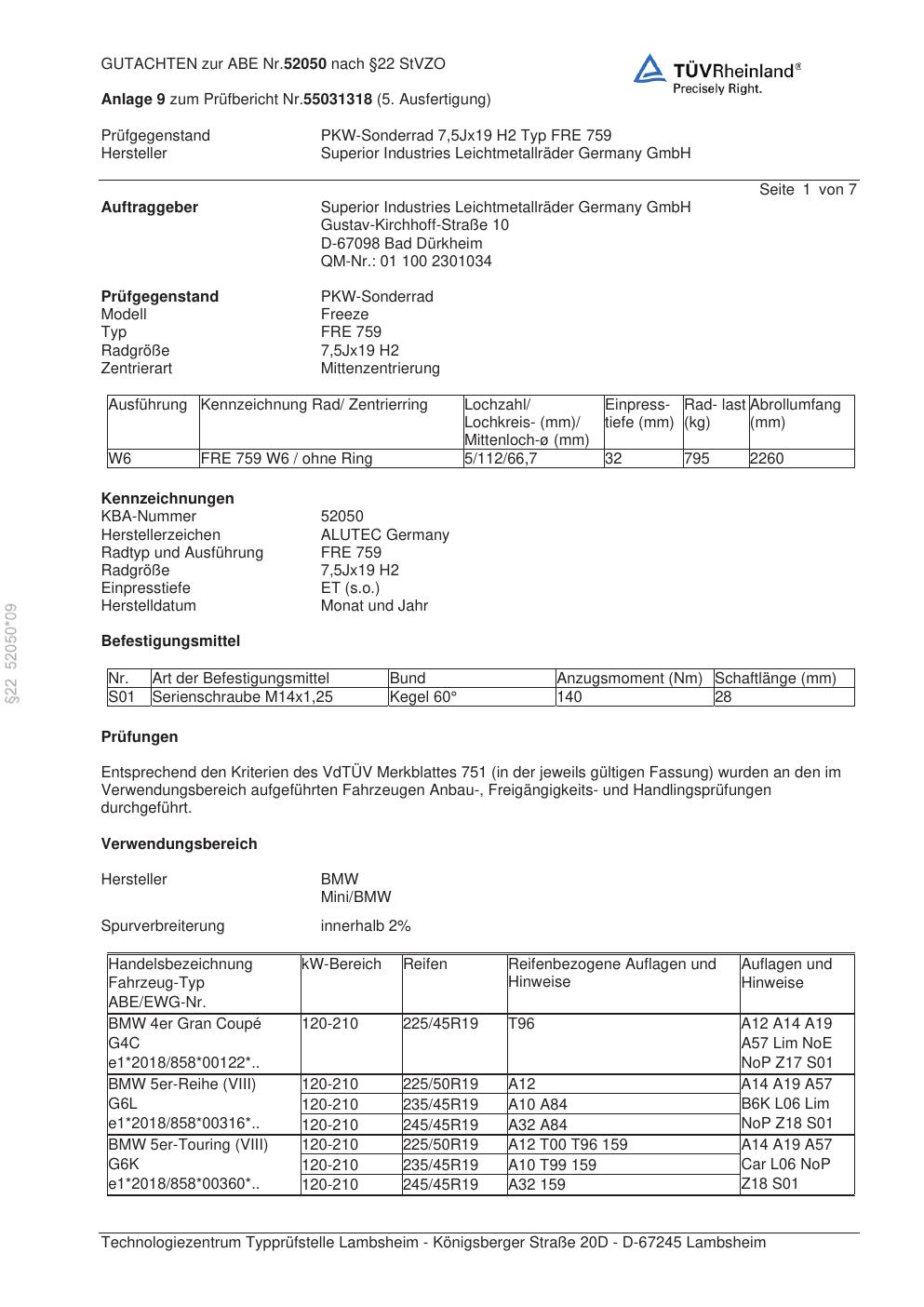Dieses Gutachten (abe) bezieht sich auf die Alufelge ALUTEC FRE 759 in der Ausführung 7.5Jx19 ET 0, Mittenloch 0 mm (KBA 52050). Im PDF findest du typischerweise zulässige Reifengrößen, Auflagen/Anbauhinweise und – je nach Dokument – Hinweise zur Eintragung.