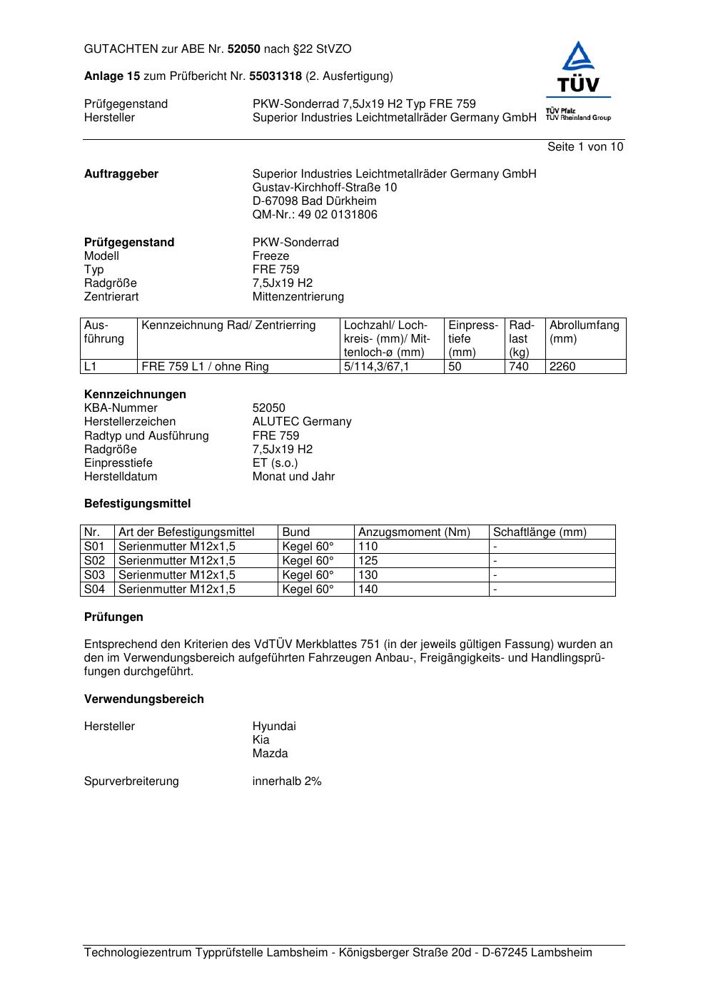 Felgengutachten / abe für Alufelgen ALUTEC FRE 759 (7.5Jx19 ET 0, Mittenloch 0 mm) mit KBA 52050 (Zertifikatsnummer 52050). Hier kostenlos als PDF herunterladen. Der Download-Link ist 24 Stunden gültig und kann bis zu zwei Mal verwendet werden.