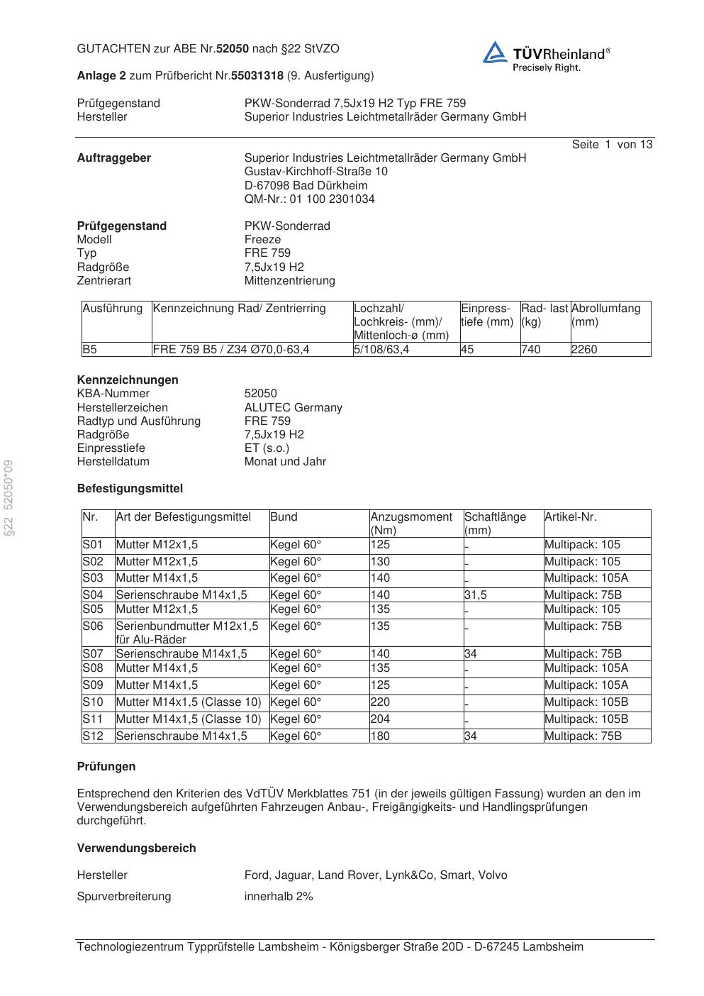 Dieses Gutachten (abe) bezieht sich auf die Alufelge ALUTEC FRE 759 in der Ausführung 7.5Jx19 ET 0, Mittenloch 0 mm (KBA 52050). Im PDF findest du typischerweise zulässige Reifengrößen, Auflagen/Anbauhinweise und – je nach Dokument – Hinweise zur Eintragung.