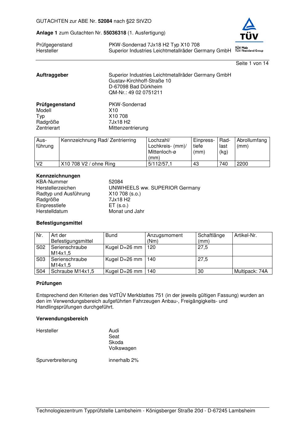 Dieses Gutachten (abe) bezieht sich auf die Alufelge Superior X10 708 in der Ausführung 7Jx18 ET 0, Mittenloch 0 mm (KBA 52084). Im PDF findest du typischerweise zulässige Reifengrößen, Auflagen/Anbauhinweise und – je nach Dokument – Hinweise zur Eintragung.
