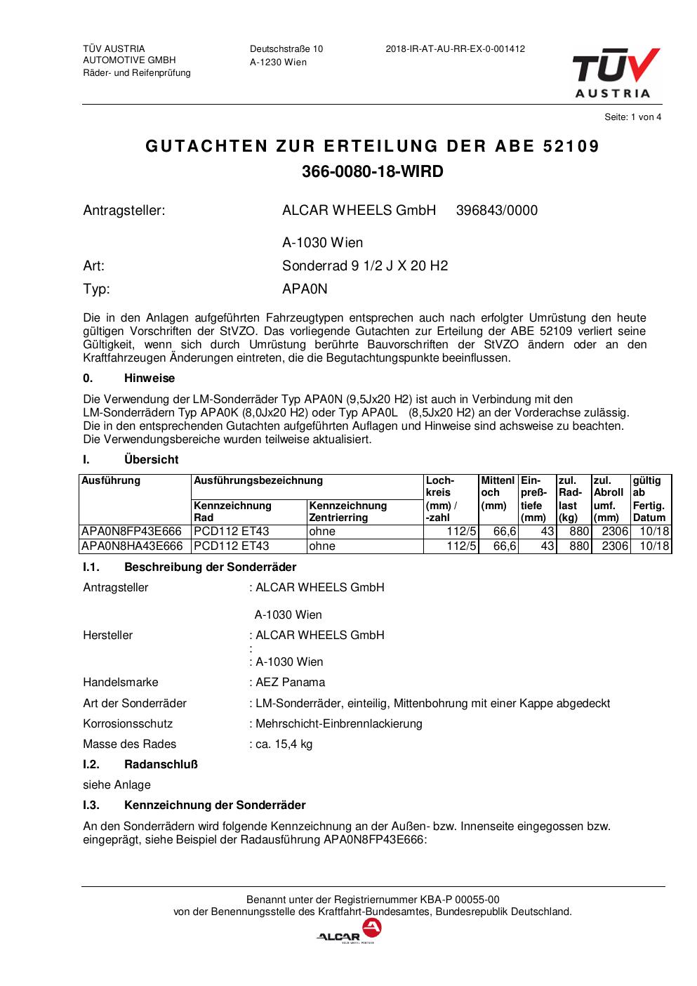 Dieses Gutachten (abe) bezieht sich auf die Alufelge AEZ APA0N in der Ausführung 2Jx2 ET 0, Mittenloch 0 mm (KBA 52109). Im PDF findest du typischerweise zulässige Reifengrößen, Auflagen/Anbauhinweise und – je nach Dokument – Hinweise zur Eintragung.