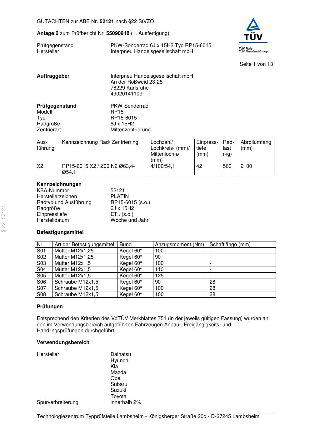 Dieses Gutachten (abe) bezieht sich auf die Alufelge Platin RP15-601 5 in der Ausführung 6Jx15 ET 0, Mittenloch 0 mm (KBA 52121). Im PDF findest du typischerweise zulässige Reifengrößen, Auflagen/Anbauhinweise und – je nach Dokument – Hinweise zur Eintragung.