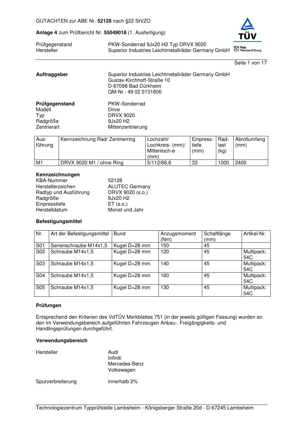 Felgengutachten / abe für Alufelgen ALUTEC DRVX 9020 (9Jx2 ET 0, Mittenloch 0 mm) mit KBA 52128 (Zertifikatsnummer 52128). Hier kostenlos als PDF herunterladen. Der Download-Link ist 24 Stunden gültig und kann bis zu zwei Mal verwendet werden.